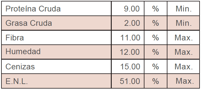 Cereales enteros termoprocesados, cereales pelletizados, pastas oleaginosas, melaza de caña, Vitamina A, D y E, carbonato de calcio, cloruro de sodio, sulfato de Magnesio, sulfato de zinc, EDDI, selenito de sodio, sulfato de cobalto, levaduras vivas.