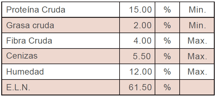 Granos molidos, cereales molidos, salvado de trigo, salvado de maíz, pastas de oleaginosas, grano seco de destilería, grasa de origen vegetal, macro y micro minerales, calcio, aminoácidos, cloruro de sodio, vitaminas A, D, E, K y del complejo B.