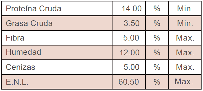 Cereales rolados, cereales molidos, subproductos de la destilería de cereales, melaza de caña, subproductos de cítrico, vitaminas A, D3, E, monensina sódica, carbonato de calcio, cloruro de sodio, sulfato de manganeso, sulfato de zinc, sulfato de cobre, EDDI, selenito de sodio, carbonato de cobalto.