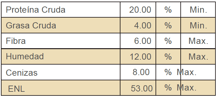 Cereales rolados, cereales molidos, pastas de oleaginosas, subproductos de la destilería de cereales, melaza de caña, subproductos de cítrico, vitaminas A, D3, E, monensina sódica, carbonato de calcio, fosfato monocálcico, cloruro de sodio, sulfato de cobre, sulfato de zinc, sulfato de cobre, EDDI, selenito de sodio, carbonato de cobalto.