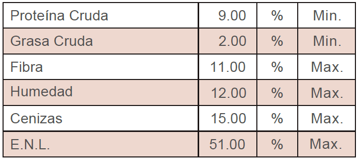 Cereales rolados, cereales molidos, subproductos de la destilería de cereales, melaza de caña, subproductos de cítricos, vitaminas A, D3, y E monensina sódica, carbonato de calcio, cloruro de sodio, sulfato de manganeso, sulfato de zinc, sulfato de cobre, EDDI, selenito de sodio, y carbonato de cobalto.