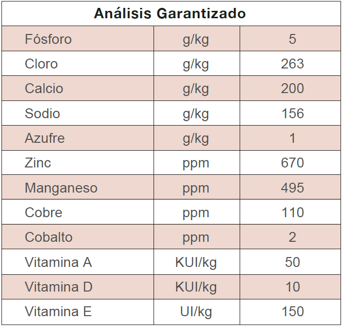 Fosfato dicalcico, carbonato de calcio, cloruro de sodio, sulfato de cobre, oxido de zinc, oxido de manganeso, selenito de sodio, carbonato de cobalto, EDDI, vitaminas A, D, E.