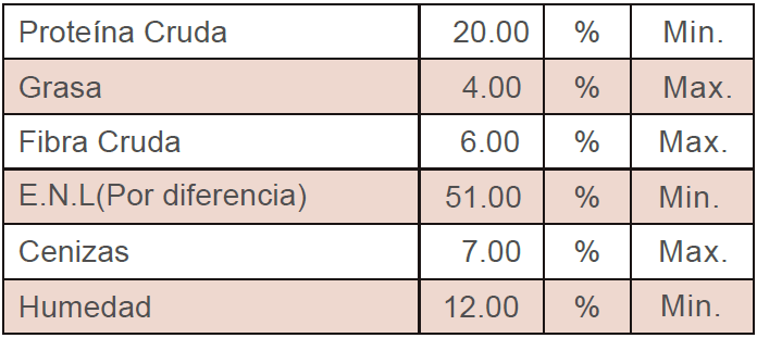 Cereales y granos rolados* cereales y granos molidos, pastas oleaginosas, subproductos de cítricos, melaza de caña; vitaminas A, D3, B, monensina sódica, carbonato de calcio, cloruro de sodio, sulfato de magnesio, sulfato de zinc, sulfato de cobre, EDDI, selenito de sodio, carbonato de cobalto.
