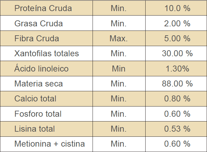 Granos molidos, subproductos de la industria aceitera, subproductos de origen animal, aceite vegetal, cloruro de sodio, vitaminas A-acetato, D3, E-acetato, K3 (MNB) mononitrato de tiamina (B1) riboflavina (B2), piridoxina HCI (B6), vitamina B12, Biotina (H), ácido fólico, niacina, D-pantotenato de calcio, cloruro de colina, antioxidante, compuestos minerales de manganeso, zinc, hierro, cobre, yodo, selenio, L-lisina HCI, DL-metionina, L-treonina, bicarbonato de sodio, fitasa termoestable 10,000 G, B-xilanasa, xantofilas, coccidiostato, promotor de crecimiento, aceite mineral y excipiente orgánico e inorgánico.